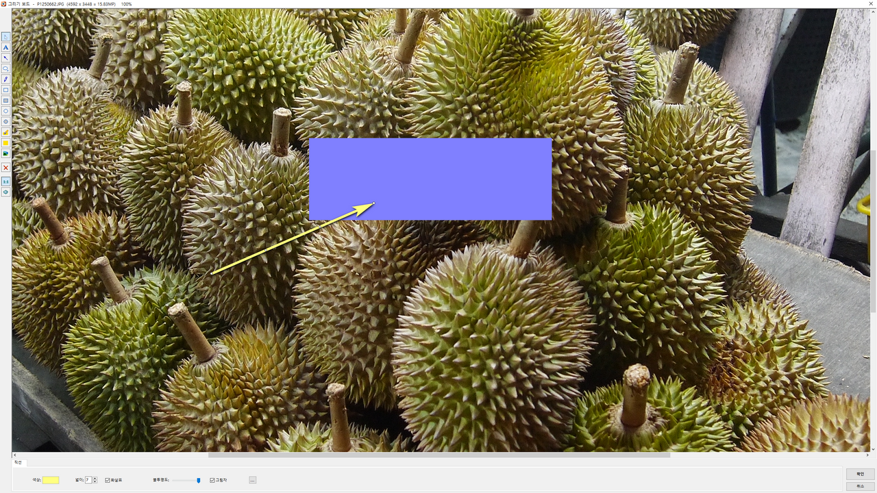 전체화면으로 사진 보기에서 마우스 오른쪽을 클릭하여 메뉴를 불러 오거나, 썸네일 화면모드에서 편집부분을 이용하여 사진의 회전, 잘라내기, 이미지 넣기, 그림그리기, 색감 조정 하기등을 할 수 있도록 되어 있습니다. 위에 캡춰사진은 그리기보드를 이용하여 간단하게 이미지를 넣어 본 모습입니다.